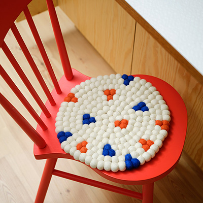 Sittdyna 26 är en rund sittdyna i ull med ett noggrant utformat grafiskt mönster och 35 cm i diameter. Mjuk att sitta på och visuellt iögonfallande, den ger både komfort och en lugn, modern känsla till rummet.