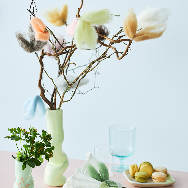 Brighten up your easter with naturally dyed wool feathers and easter eggs for a Scandi-style easter tree, in ecological material. Easter means eggs, and feathers and we bring you naturally dyed wool feathers - an animal-loving way to decorate your Easter tree or branch. Let go of an old tradition in favor of wool birds - an animal-friendly and cute easter décor.