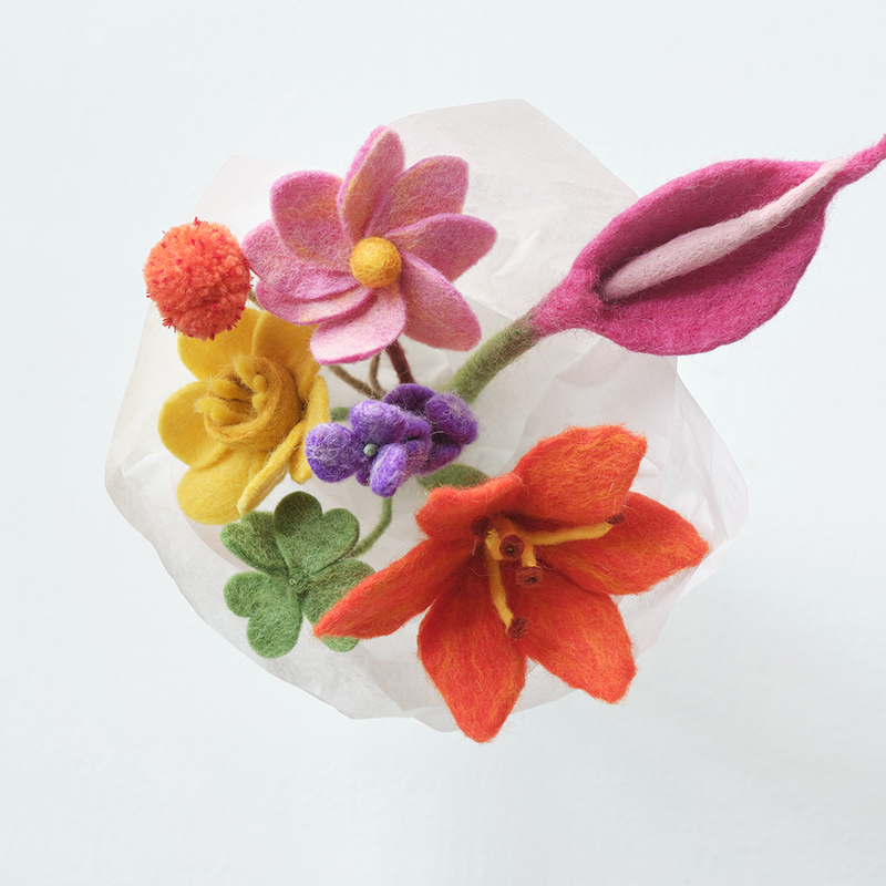 This bouquet of handmade flowers in 100% wool, will last forever and remain beautiful for generations. The bouquet includes 7 flowers wrapped in paper.