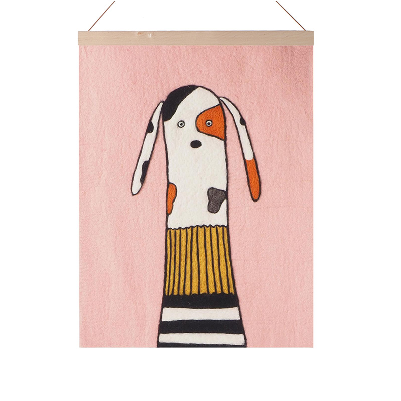 Happy and friendly dog, just waiting with patience. In a pink room. Felted by hand in natural, azo-free colors. Made from soft, absorbent wool, this decorative wall hanging will help to dampen the sound in the room and bring a wonderful sense of happiness and joy.