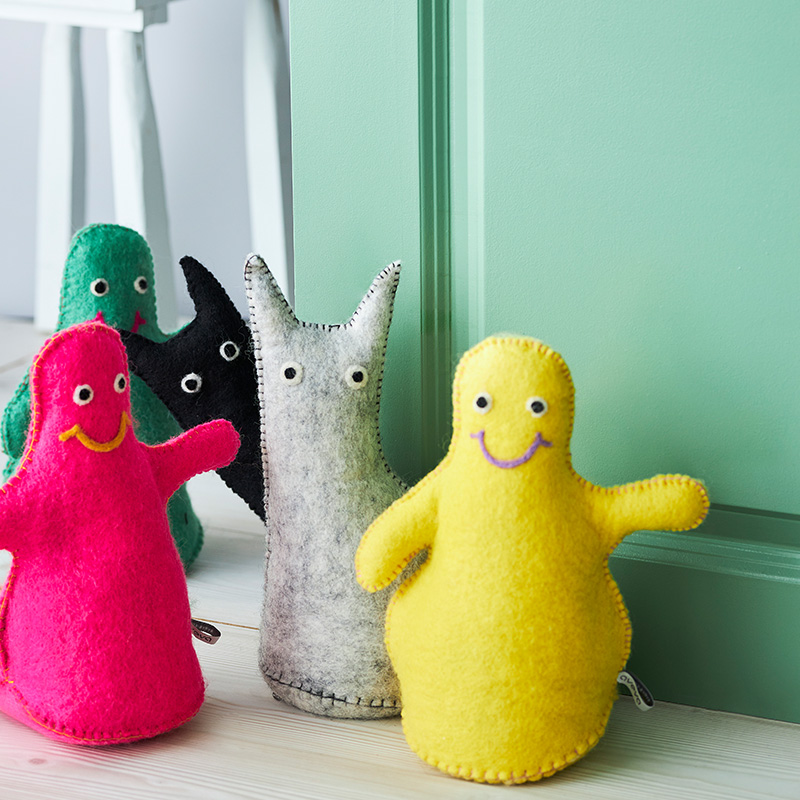 En glad concierge i ull, fylld med svensk ull och småstenar som håller ordning på böcker och dörrar. Inget mer smäll i dörrar eller böcker som faller. Förutom att vara ett praktiskt dörrstopp/bokstöd fungerar den även som en dekorativ och stilfull inredningsdetalj!
