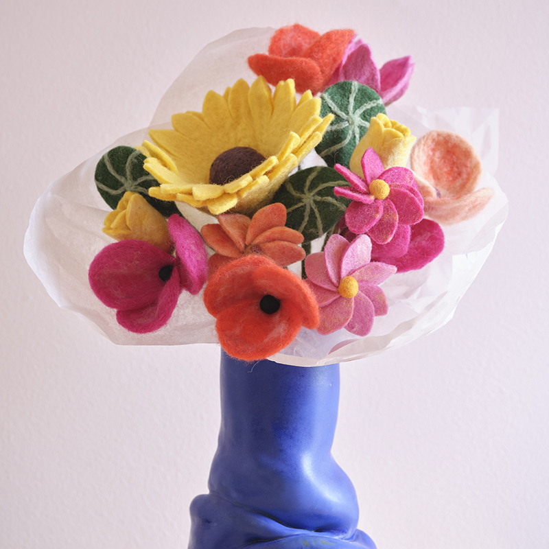 Denna bukett med handgjorda blommor i 100% ull, kommer att hålla för evigt och förbli vacker i generationer. I buketten ingår 14 st blommor inslagna i papper.