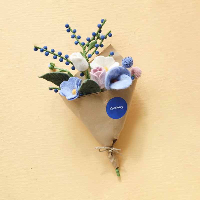 Denna bukett med handgjorda blommor i 100% ull, kommer att hålla för evigt och förbli vacker i generationer. I buketten ingår 9 st blommor inslagna i papper.