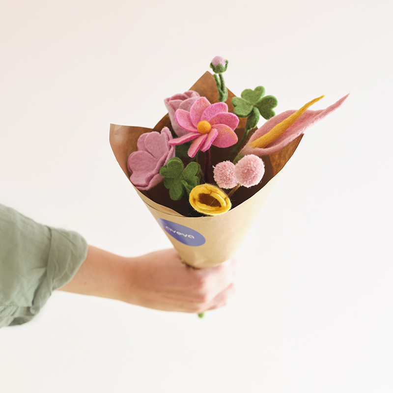 Denna bukett med handgjorda blommor i 100% ull, kommer att hålla för evigt och förbli vacker i generationer. I buketten ingår 10 st blommor inslagna i papper.