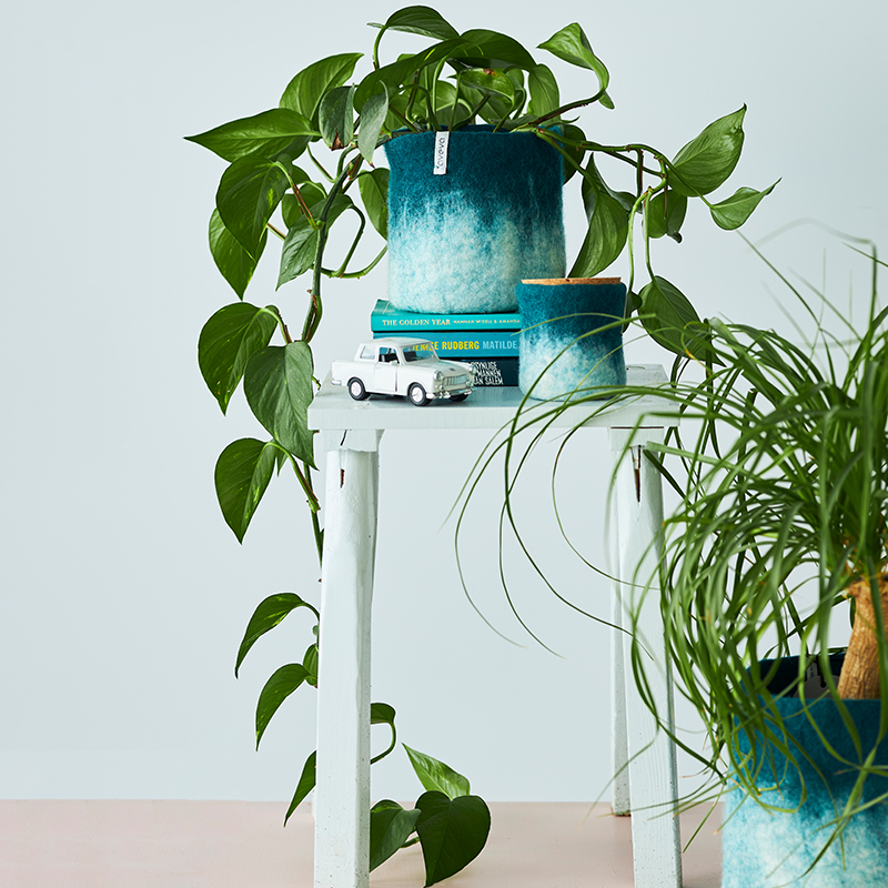 Avevas handgjorda krukor i ull med platt botten och två olika färger som blandar sig med varandra vilket ger en härlig ombré effekt. Insidan är behandlad med naturgummi vilket gör krukan vattentät. Perfekta krukor att placera i fönsterkarmen, på golvet, bordet eller varför inte hängande. Kombinera gärna Kruka 18 med vår ampel, rekommenderad till krukorna i storleken medium och large. Välj bland alla våra fina färger och placera dina växter i våra snygga ullkrukor.