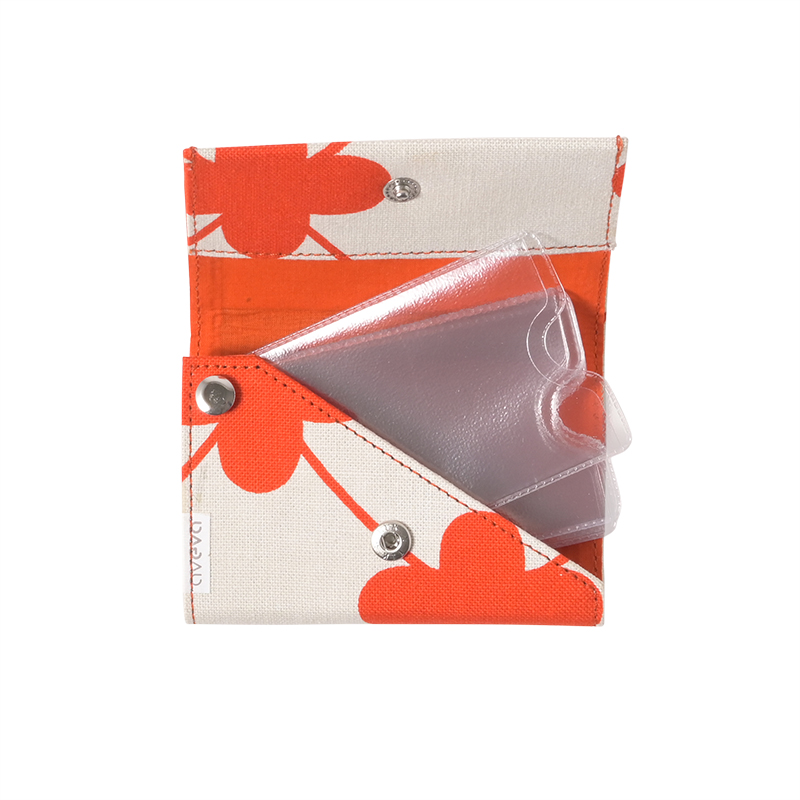 Plånboken är handgjord i bomull och innehåller tio stycken plastfickor med perfekt passform för plastkort, som bank- och medlemskort.